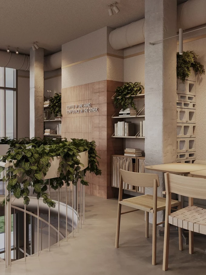 «За філософією Slou в інтер’єрі немає візуального шуму», – кажуть у команді. Заклад розрахований на 50 посадкових місць. Великі книжкові полиці формують залу для відпочинку, а спільні столи створюють простір для роботи з видом на центр міста.